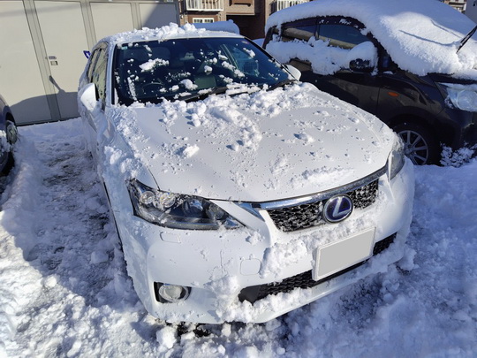 2024-01-08 天候回復 #自動車 #日記 朝は曇りでまた降りそうな空模様でしたが、雲が切れて青空が増えてきました。 CTに積もった雪を下ろします。20cmは越えていると思います。 下ろしただけでは周りの積雪が増えてしまうので、クルマの周囲もアスファルトレベルまで除雪してクルマの後ろに積み上げます。 太陽が出たので、雪がどんどん溶けていきます。路面状態も良くなっていきそうなので日帰り温泉へ出掛けたいと思います。